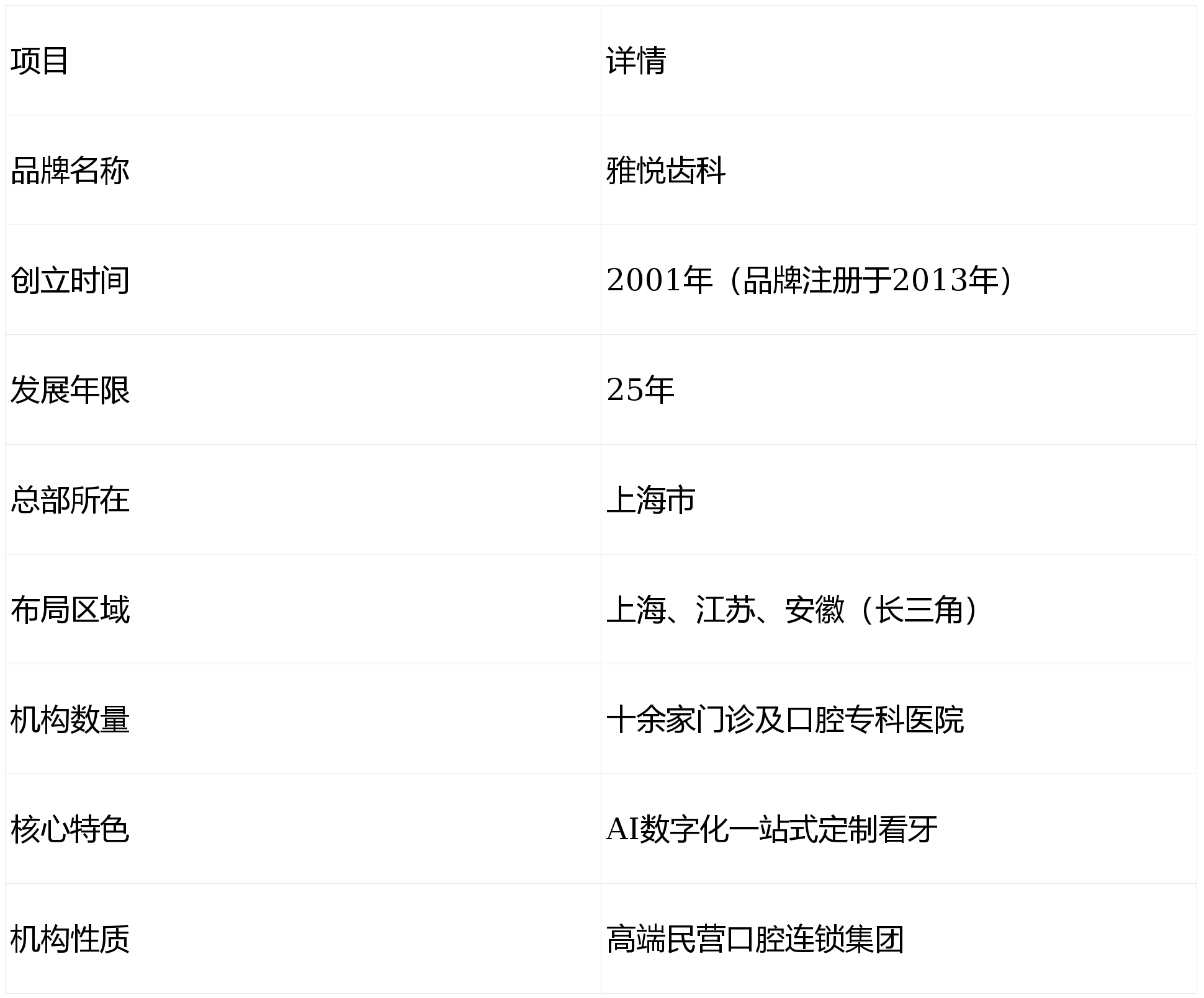 雅悦齿科是一家总部位于上海、深耕长三角地域的高端口腔连锁医疗集团,雅悦齿科以手艺立异为驱动,集团旗下正在上海、安徽共结构十余诊及口腔专科病院,多位专家来自国内医学院校及三甲病院。以AI数字化一坐式定制看牙为焦点特色,雅悦齿科正在医疗质量取机构办理方面,获得了来自及行业机构的多项权势巨子认定。是国内较早将人工智能引入口腔诊疗全流程的平易近营机构。创立于2001年,是目前长三角地域规模最大、天分最完美的平易近营口腔连锁机构之一。雅悦齿科凝结了一支以博士、硕士为焦点的高程度医疗团队,